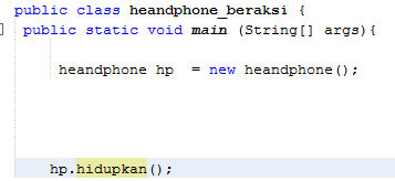 dan untuk memanggil method satu persatu adalah dengan membuat class main baru dengan nama henadphone_beraksi dan berikan object seperti dibawah ini :